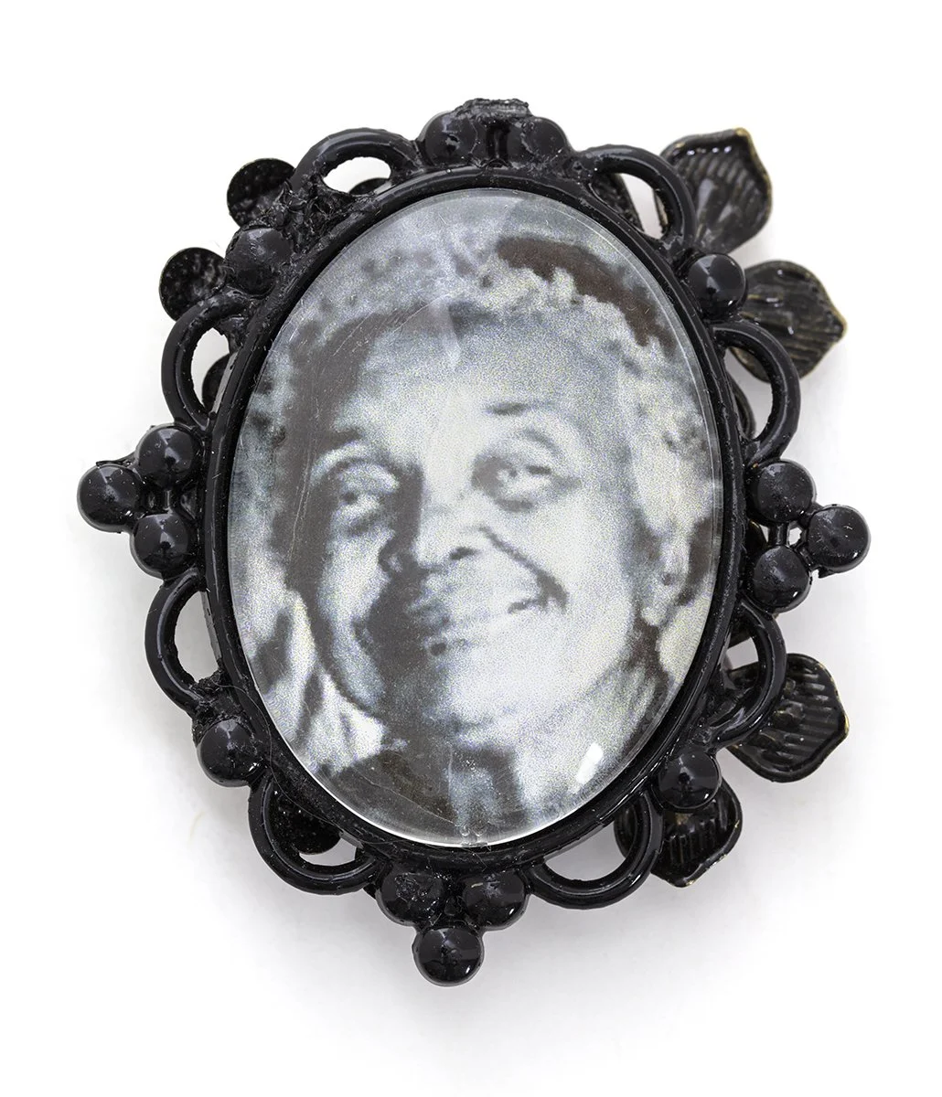 Rucker’s heavily ornamented artworks mix symbols from medieval European Christianity and 19th-century Black American churches and spirituality. In You Don’t Have to Go to Church to Get Your God (2024), he appropriates a font —a vessel containing Holy Water typically positioned near the entrance of a Catholic church to remind worshipers of their baptisms. Fonts are typically crowned by a crucifix, angel, or symbolically significant animal; Rucker’s features a cross covered in crystals and rhinestones and displays, at its center, a lenticular black-and-white photographic print that shows an image of Black Christ or an image of his maternal grandfather, James Mansel, depending on the angle at which you view it. This oscillation challenges the distinction between the veneration of the two figures. Both images are vignetted into ellipses and blurred at the edges in a manner suggestive of a halo.