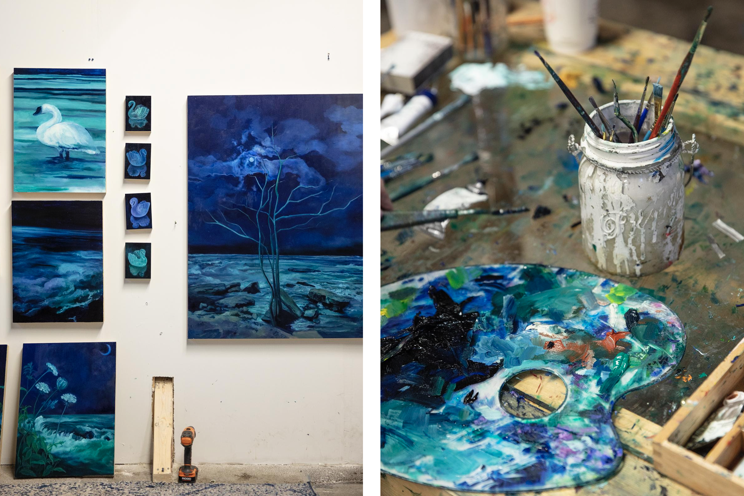 “The work begins with a meditative intake of my immediate landscape in Detroit, balanced by the memory of immersive sites in Appalachia, such as the Youghiogheny River, which uniquely runs north. These locations provide a foundation, but as I paint, the physical site dissolves into something more intuitive. I treat the flora as ingredients for a visual spell, sometimes subverting their natural logic to capture a specific frequency. For example, while Chicory typically only opens in sunlight, in my piece Chicory in the Night Rapids, it is blooming in the moonlight instead. This shift moves the work into a space of mythic reverence for nature.”