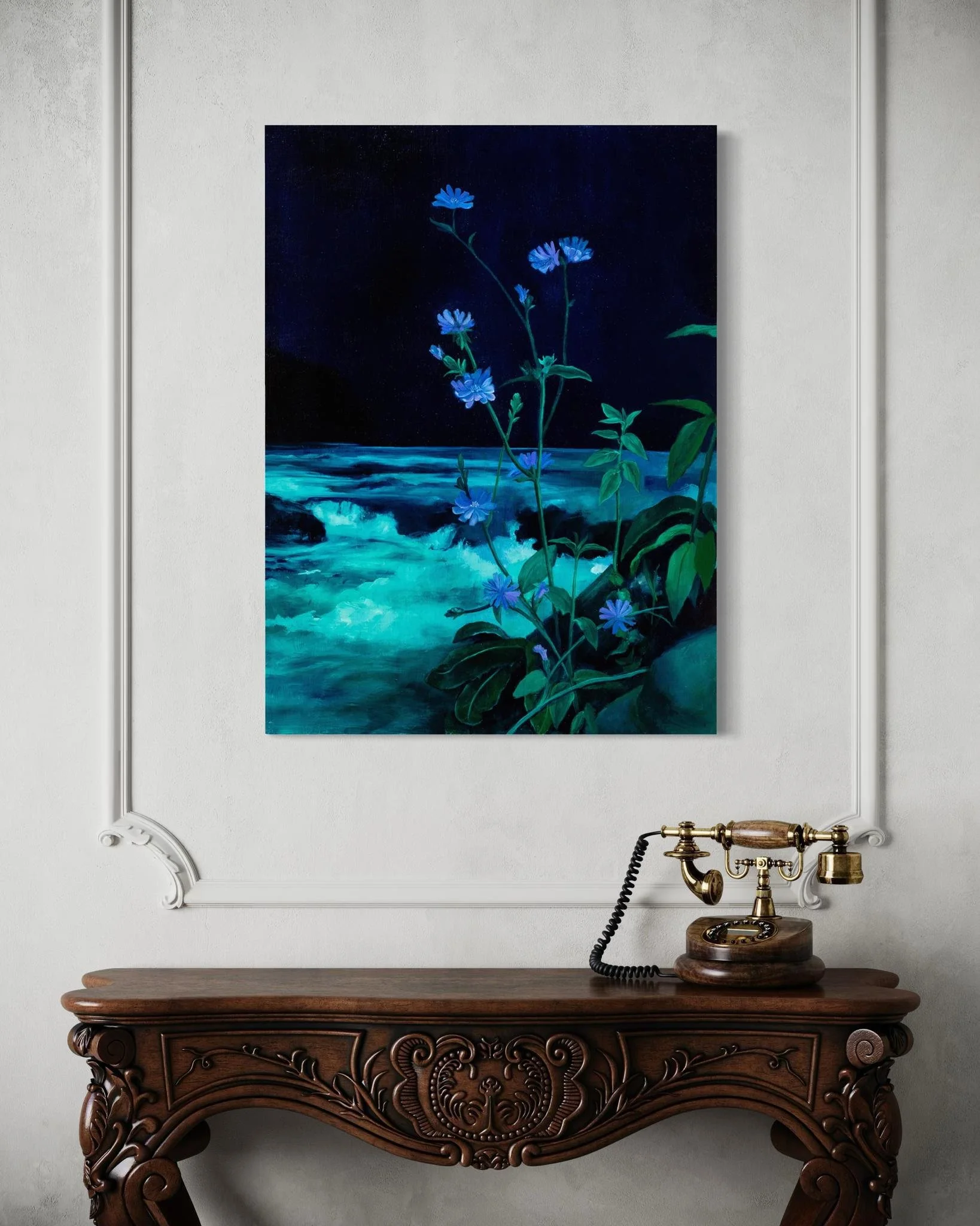 Chicory typically only opens in sunlight, in my piece Chicory in the Night Rapids, it is blooming in the moonlight instead.