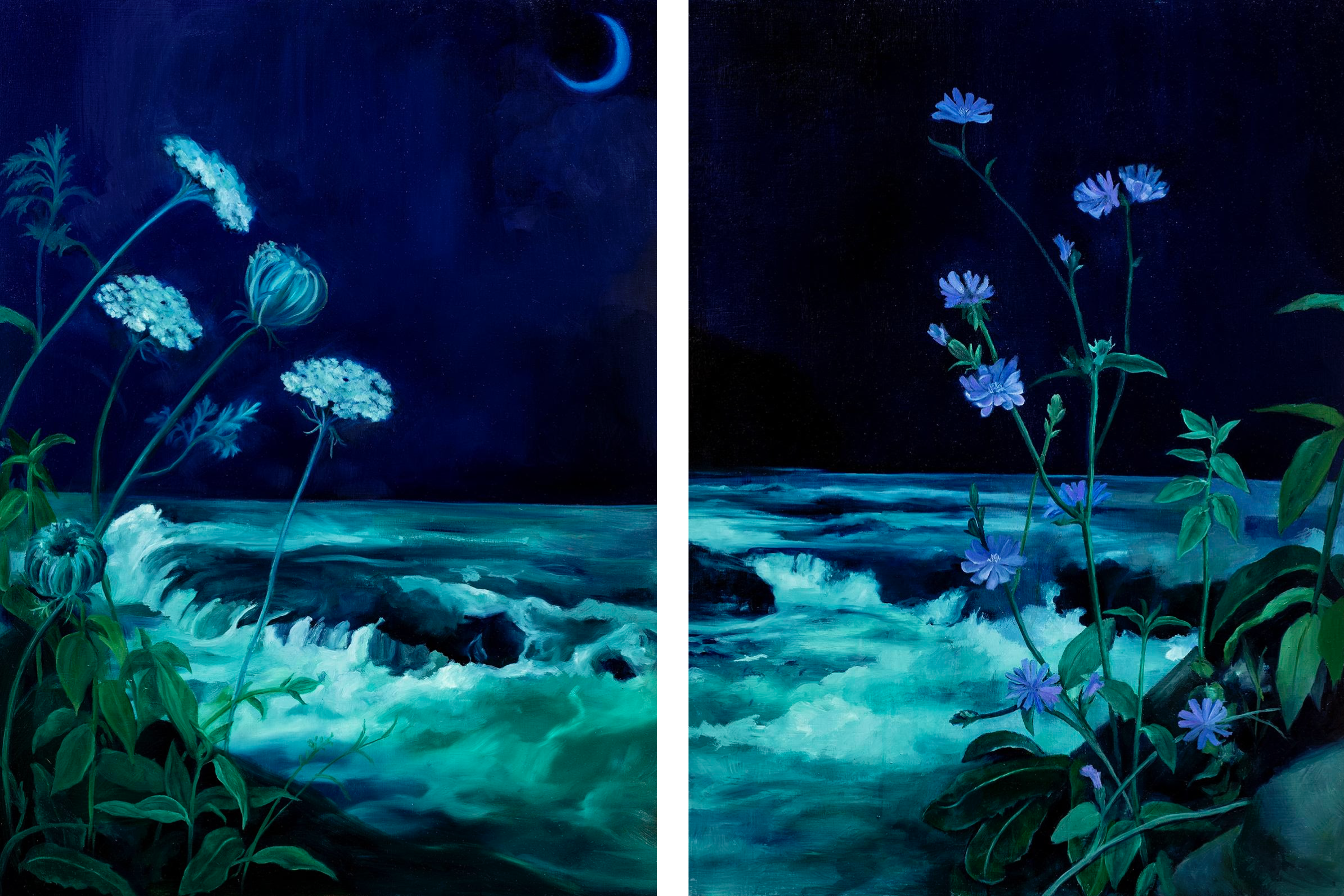(Right) MARCELINE MASON, Chicory in the Night Rapids, 2025 | Oil on panel, 24 × 18 inches