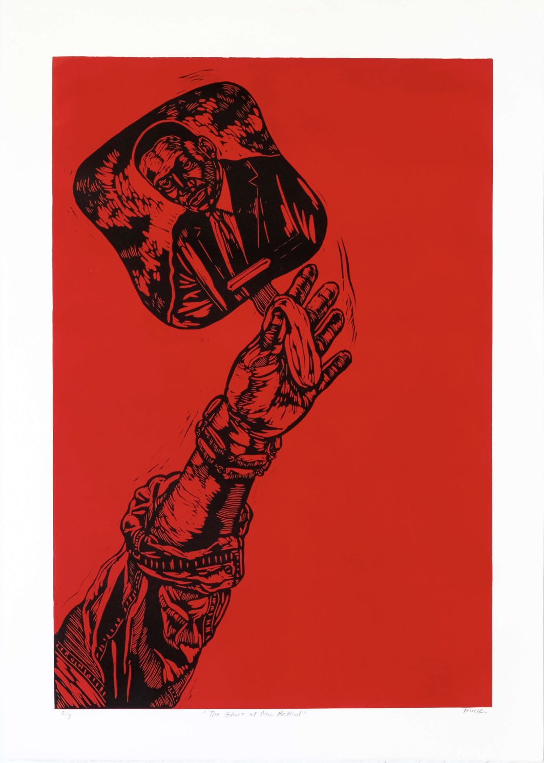 Rashaun Rucker’s Ghost of New Bethel, a 2021 relief print from his Up From the Red Clay series, reflects on the Black church’s profound impact on his life. Referencing the Holy Ghost and the New Bethel Church—once home to Martin Luther King Jr.—Rucker uses a church fan, a familiar symbol in the Black church, to blend the sacred with the everyday, honoring the past while exploring connections between faith, identity, and community.
