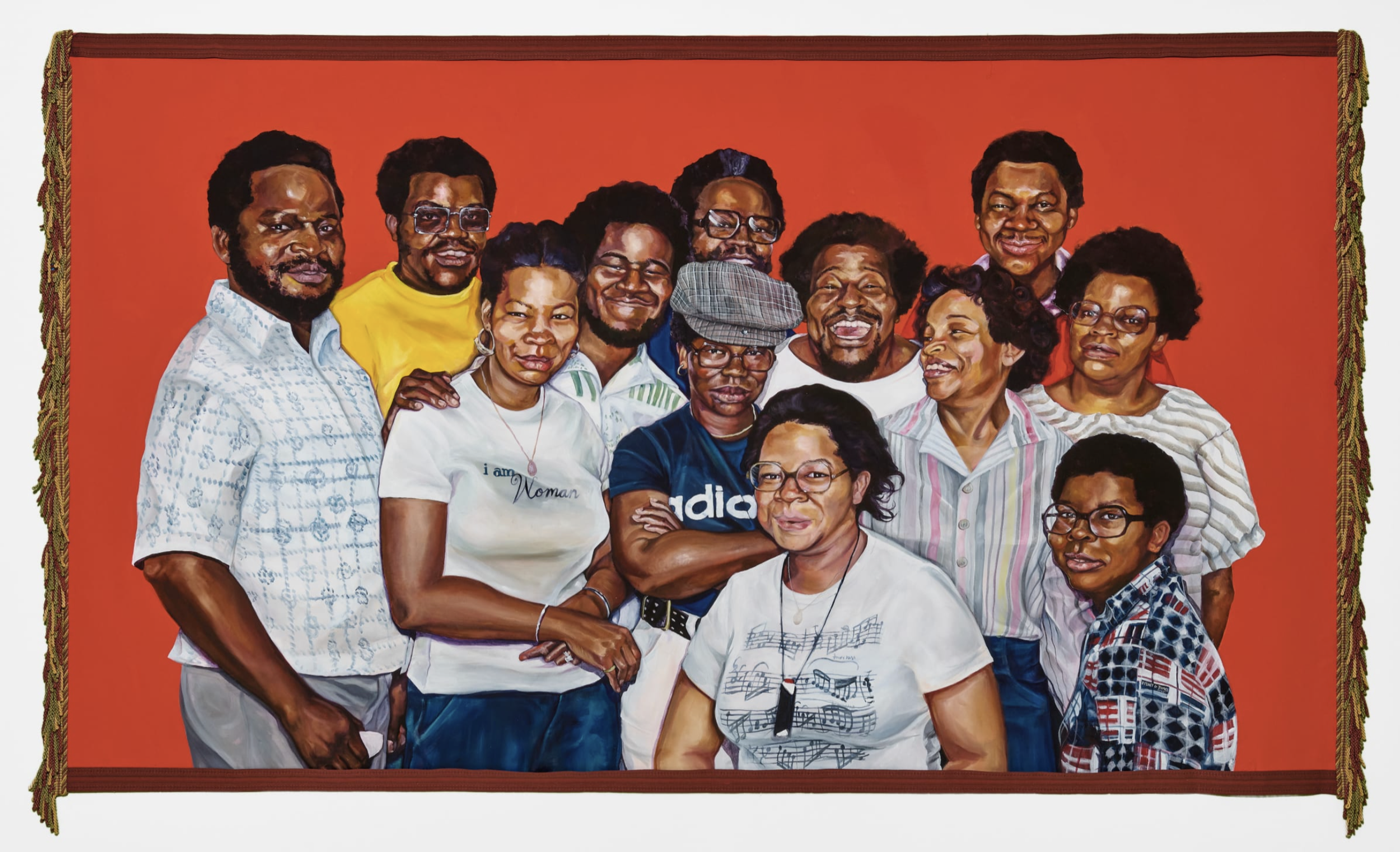 The Westside Johnsons is a contemporary reimagining of a 1978 photograph featuring 12 adult siblings—the Artist’s mother and her 11 brothers and sisters. Consistent with her practice, James uses rich color, bold composition, and meticulous attention to detail to celebrate the strength and warmth of her subjects while preserving Black cultural narratives . The intricate tassels on the border reinforce the idea that these everyday moments deserve to be cherished and remembered.