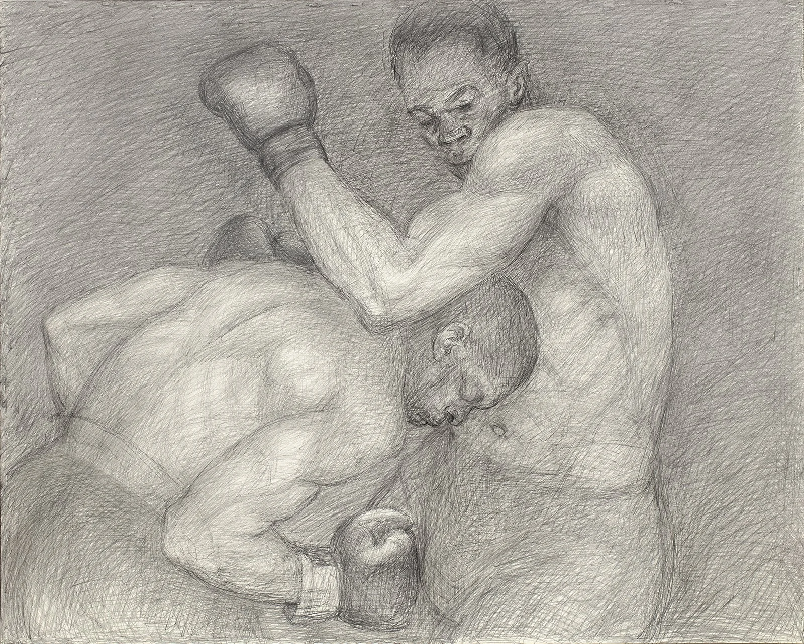 Through intricate line work and careful shading, Richard Lewis conveys the tension between two fighters locked in a physical and psychological battle. The figure in the crouch, has his head lowered and body coiled in resilience and anticipation, while his opponent looms above. Lewis’ Boxing Crouch, captures a moment of raw intensity and quiet strategy within the ring reflecting not only boxing but life.