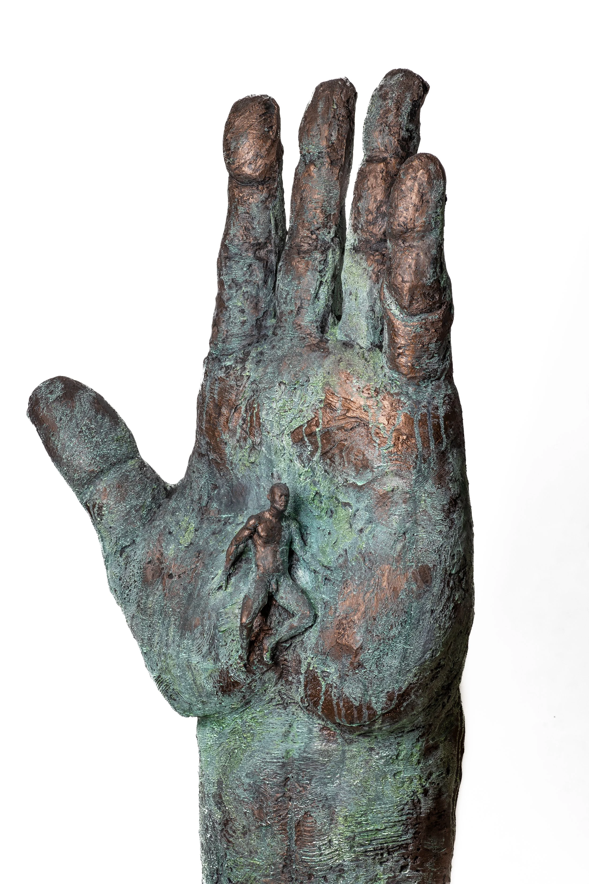 In Held, Sculptor, Austen Brantley examines the role of the creator and draws a powerful connection to the myth of Pygmalion and Galatea, where the artist’s touch breathes life into raw material. In this work, a lone figure emerges from the immense hand, symbolizing the act of creation at the hands of the creator. Brantley creates a tension between stillness and motion, evoking the moment where potential is realized—where art transcends medium and the inanimate begins to embody life.